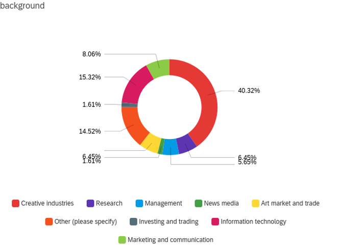Regarding employment and professional background, the keyword is variety. According to the 99 replies collected, users are mostly self-employed (nearly 60%) or working as employees (36%), and usually come from creative industries (40%), Information Technology (15%) or marketing and communication (8%). About 6% are involved in art market and trade, research, or management, and although 14% of the total decided to specify their background, most replies were still tied to creative industries and tech, which can be confirmed as leading background sectors.