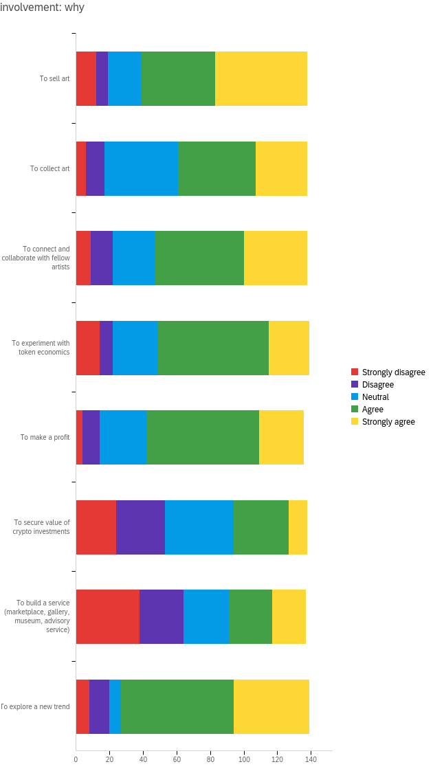 When asked why they got involved in crypto art, about 80% of the 130 survey participants who replied to this question affirmed that they wished to explore a new trend, while about 70% (strongly) agreed with the idea of entering the space to either sell art, connect and collaborate with fellow artists or make a profit. It is interesting that not everyone involved wishes to profit from what was essentially born as an art market. These results indicate that some people started engaging with the crypto art world to enjoy a variety of aspects beyond economic benefits, and are interested in social or aesthetic aspects. In particular, collaborative attitudes and the idea of sharing seem to be recurring traits in the crypto community, as some of the following results will clarify.