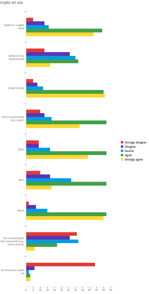 Over 80% of the 129 people who replied to this question agree or strongly agree on holding and exhibiting their art online, with about 75% doing it also in digital worlds and only 40% in the physical one. About 70% use crypto artworks as profile images or sell them. Over 55% gift their art and 25% show neutrality on the matter. Combining these results with those of another survey question on restrictions in crypto art, we find out that unrestrained use remains appealing to crypto art users, as 40% wish crypto art to remain unrestricted in the future while 41% think – and perhaps fears – some regulations might appear with time. Interestingly, less than 20% want such restrictions to be applied.