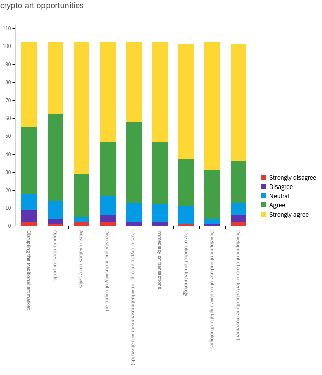 Regarding the opportunities represented by crypto art in general, the 98 people who replied mostly agreed with the suggested selection. The most strongly perceived opportunity is the development and use of creative digital technologies, paired with artist royalties on re-sales (both about 95%). Again, we see how crypto art’s innovative character and the possibility for artists and creatives to keep profiting from their works over time are crucial to the community. In second position, we find the use of blockchain technology and the development of a counter/subculture movement (about 90%); strongly valued are also diversity and inclusivity of crypto art, together with transactions’ immediacy (about 87%).