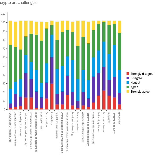 Considering the same people’s (strong) agreement with the proposed options, when it comes to crypto art challenges, the Fear of Missing Out (FOMO) leads the way with 77%; somewhat all in second position we find: transaction fees (68%); unequal access to opportunities and role of superstars (both 67%); inequality of outcomes (66%) and platform lack of interoperability (65%). The third place goes to technological maturity of blockchains, speculation and volatility of cryptocurrencies (about 54%), together with regulations and taxation and overtokenization and artwork inflation (about 52%). This shows that despite its initial accessibility, the crypto environment actually presents some economic, technical and perhaps social limits. In particular, it seems that factors like unequal visibility and hype are particularly felt by the community. What worries users the least is the risk of crypto art being a bubble, as about 61% do not feel this as an actual challenge.
