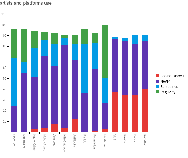 Apparently never used but at least known to most are NiftyGateway (85%), MakersPlace (71%) and Foundation (64%), closely followed by ArtBlocks (61%), AsyncArt (59%), SuperRare (57%) and KnownOrigin (50%).