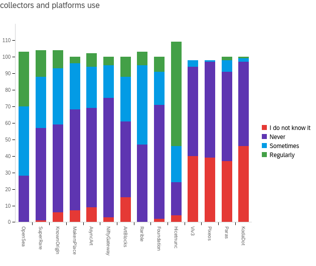 Looking at platform usage, nearly 60% of collectors made regular visits on Hic et Nunc, outperforming artists’ results; OpenSea was selected by 31%, used nearly as frequently as by artists, while SuperRare got 15%; these are followed by ArtBlocks and KnownOrigin. Rarible leads among the platforms used only sometimes, with 45% of votes, followed again by OpenSea (40%), KnownOrigin (32%), SuperRare and MakersPlace (both about 27%).